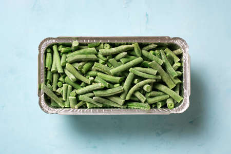 Frozen green beans in a plastic container for long-term storage. Deep freezing of vegetables. Frozen food vegetables on color background. Copy space for text. Stocking up vegetables for winter storage