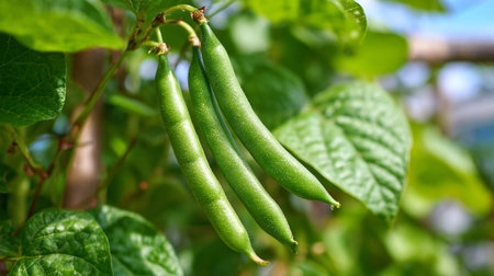 Fresh green bean pods hanging on the vine in the garden