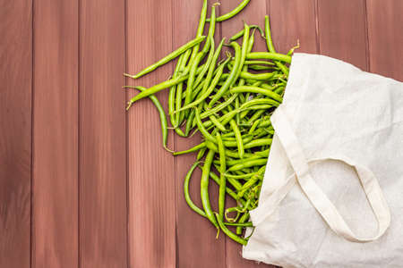 The cowpea (Vigna unguiculata). Fresh long beans in reusable shopping cotton bag. ECO trend to reduce disposable plastic. Wooden boards background, copy space, top view