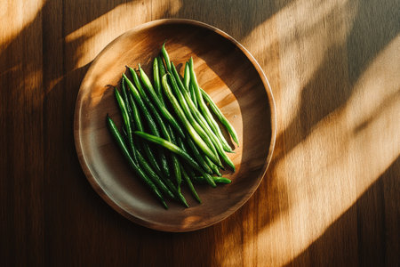 Freshly harvested green beans are artistically placed on a round wooden plate. Natural light spills across the surface, creating elegant shadows in the afternoon.