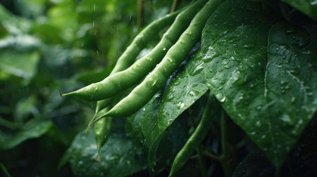 Fresh green beans glistening with water droplets after a summer rain shower.