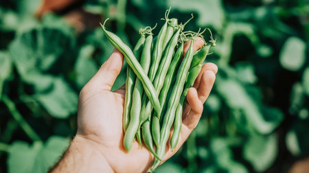 A hand holding fresh green beans harvested from an organic garden. Perfect for promoting healthy eating, gardening, and farm-to-table concepts.