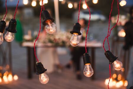 Festive retro garland against the evening sky. Wedding, celebration, event concept.
