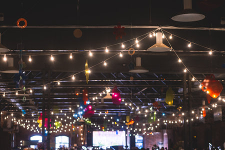 A mesmerizing scene of hanging lights creating a warm ambiance. The strands of twinkling lights offer a dreamy backdrop perfect for celebrations and events.