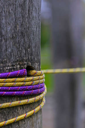 Color rope knot, three colors red, blue, yellow. The concept of bondage, connection, relationship pull the rope