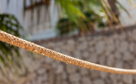 Horizontally stretched thick rope made from natural fiber close-up against a background of green plants