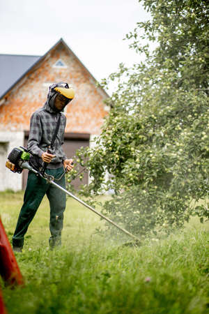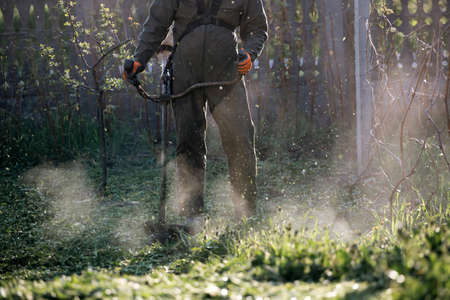 Mowing trimmer. Mow the grass with lawnmower. Gardening