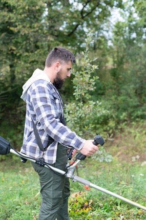 Caucasian Gardener working man Manual hand grass cutter Weed Cutter or Power Weeder or Brush Cutter Lawn Mowe Gasoline close up