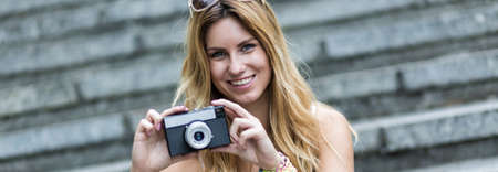 Woman with camera outdoors. Girl takes pictures. Hobby, leisure or profession