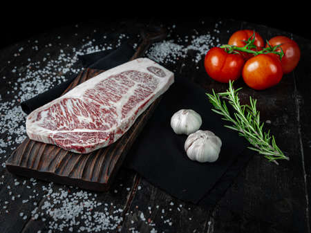 Piece of Wagyu beef steak. Raw beef steak with pepper, tomatoes and herbs on a wooden background in a butcher shop Japanese premium product.