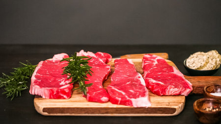 Raw meat steaks of various cuts on a butcher block ready to be barbecued grilling hamburgers with seasoning salt and pepper and rosemary garnish farm fresh from Montana