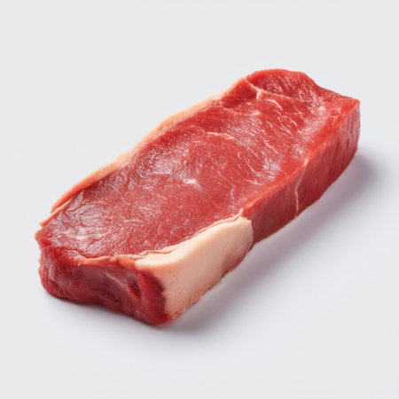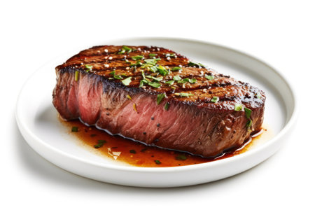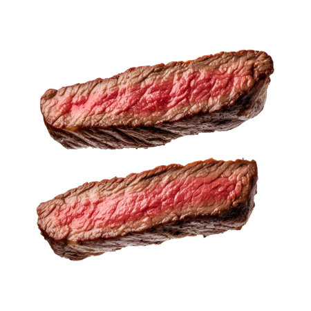 Beef fillet slices isolated on white. Dark aged meat of one year old cattle. Yellow streaks of fat.