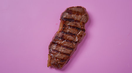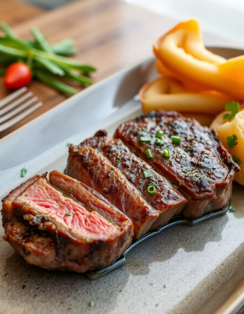 Medium grilled strip loin beef steak. Beef steak on fork in warm light at restaurant.