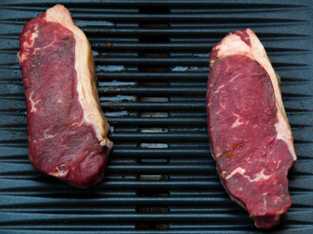 Grilling cooking new york beef strip sirloin steaks on cast iron grill pan skillet on a electric ceramic stove counter top at home