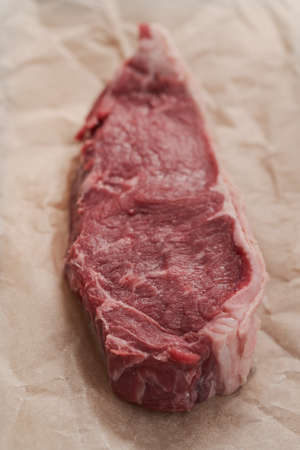 Raw new york sirloin steak on parchment paper warming up before cooking