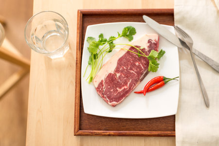 The image showcases a raw steak, likely a ribeye cut, . The meat is marbled with fat,