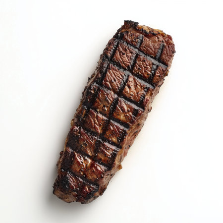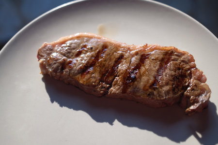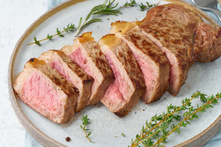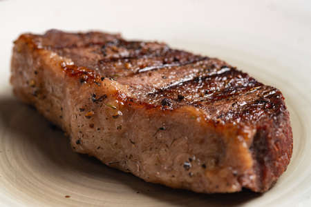 Keto ketogenic diet beef steak, striploin on gray plate on white background