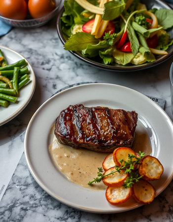 grilled beef steak with mushroom sauce and vegetable saladle table