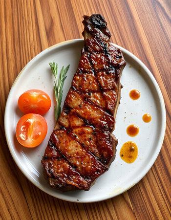 Grilled pork chop with vegetables on a wooden board in a restaurant