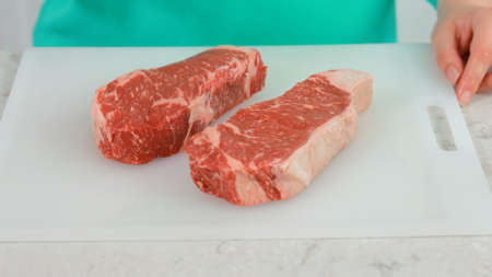 Step by step. Raw New York strip steak ready for outdoor grilling.