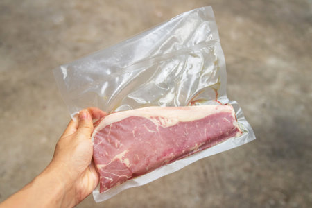 Premium Rare Sirloin Dry-Aged Wagyu A5 beef with high-marbled texture inside refrigerator.
