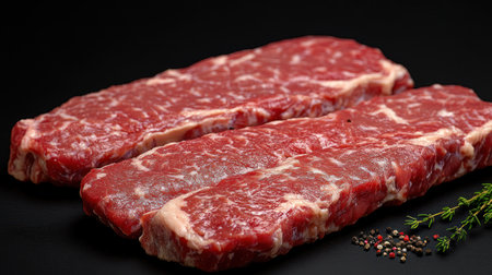 Raw beef meat for steak preparation. Raw beef sliced, preparation of meat for cooking steak at the culinary master class. Raw meat on a black plate.
