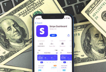 Kharkov, Ukraine - May 28, 2021: Stripe Dashboaed application close-up with icon and logo, background of the money