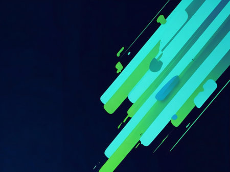 Abstract 3D render of layered geometric shapes in shades of blue, green, and purple with softly rounded edges, creating a dynamic pattern.