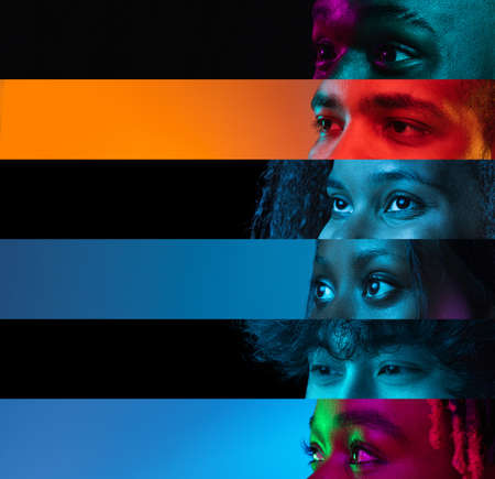 Collage of close-up male and female eyes isolated on colored neon backgorund. Multicolored stripes. Concept of equality, vision, emotions