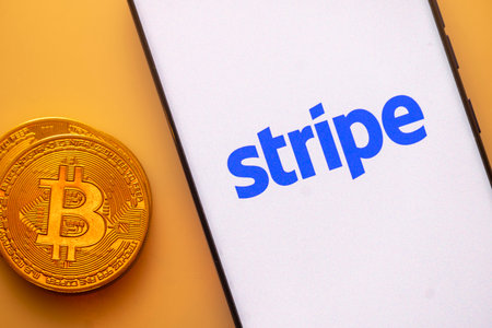 Dhaka, Bangladesh 22 September 2025:Bitcoin coin alongside a smartphone showing the Stripe logo on a light background