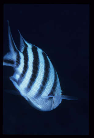 striped fishes swimming under water in aquarium with blue lighting