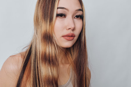 Young woman with long straight hair and natural makeup wearing a sleeveless top posing against light background. Beauty, portrait and fashion concept with casual style.
