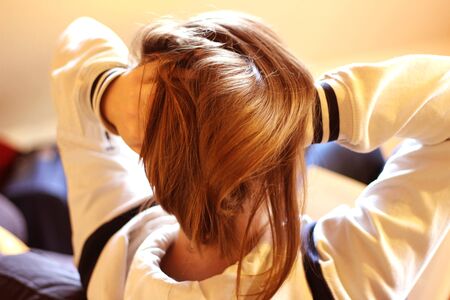young woman with long hair relaxing on a sofa, stretching, rear view