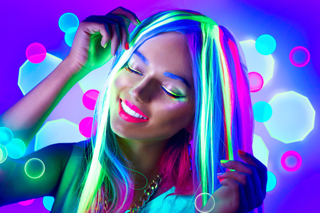 Young woman dancing in neon light. Beauty model girl with fluorescent make-up