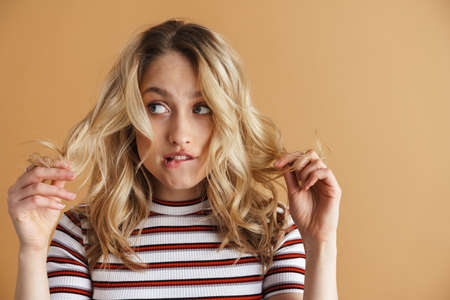 Young confused woman holding her demaged hair isolated over beige background