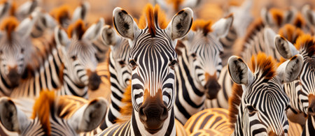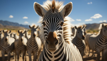 Zebra herd in African savannah, nature beauty in striped pattern generated by artificial intelligence