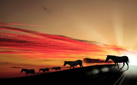 African zebras walking on dusty plains at the sunset, Kenya, Amboseli National Park