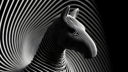 An abstract horse sculpture with black and white striped pattern creating hypnotic optical illusion effect in dark background
