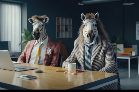 Two people in zebra masks sitting at office desk with laptop, concept of creativity, AI Generated