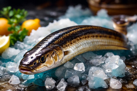 Fresh eel seafood on crushed ice at fish market. Fresh frozen on store counter in hypermarket. Frozen sea fish on display counter at store. Concept of retail food backgrounds. Copy ad text space
