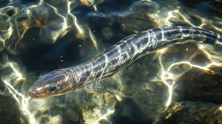 This stunning close-up captures a freshwater fish swimming gracefully in clear water, reflecting sunlight and showcasing the beauty of aquatic life.