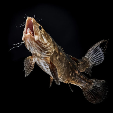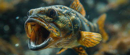 Underwater closeup of a predatory fish with open mouth, murky water, eerie lighting, detailed textures, natural habitat setting