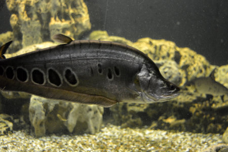 A close-up shot presents a fish with spotted patterns, set within a well-lit aquarium environment. The fish is the central focus, surrounded by aquatic plants and a blurred background. This image highlights natural colors and textures, potentially suitable for educational resources, nature publications, or decorative purposes.
