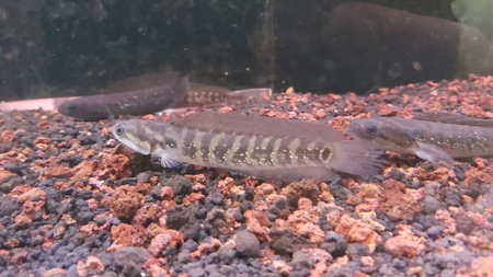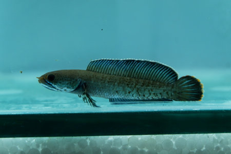 Snakehead fish Channa asiatica swims in the aquarium.