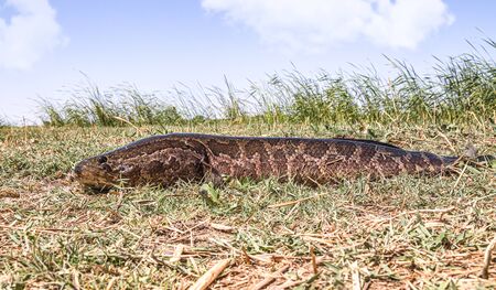 big snakehead murrel fish ilaying on ground in nice blur background