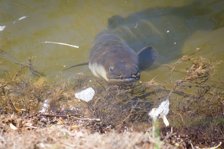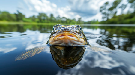 This striking close-up photograph captures a fish swimming in a serene freshwater lake. The reflection on the water surface highlights the beauty of nature, making it perfect for various uses.