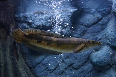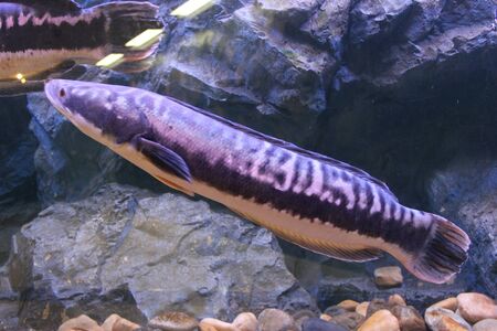 Snakehead fish (channa marulius) in aquarium. Wildlife animal.