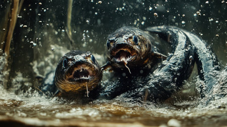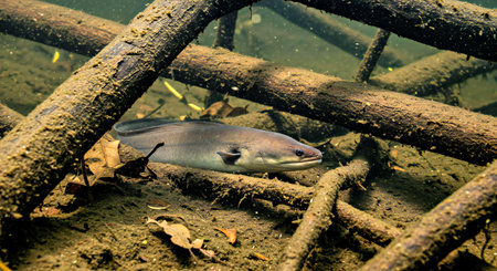 Amidst bubbles and swirling currents, eels swim determinedly towards the Sargasso Sea, fulfilling their ancient ritual of spawning in a mystical underwater world.