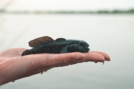 Caught trophy fishing on the hand of the fisherman. Black terrible monster fish.