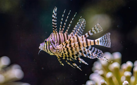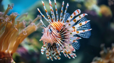 A vibrant lionfish glides through a colorful coral reef, showcasing its majestic fins and unique patterns. An exquisite view of underwater life.